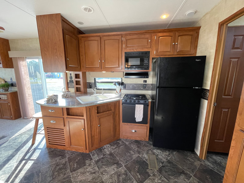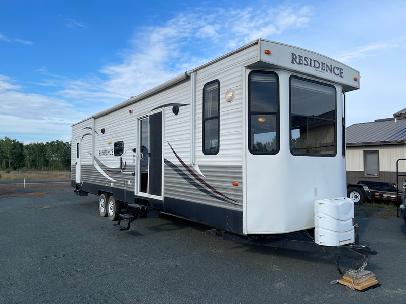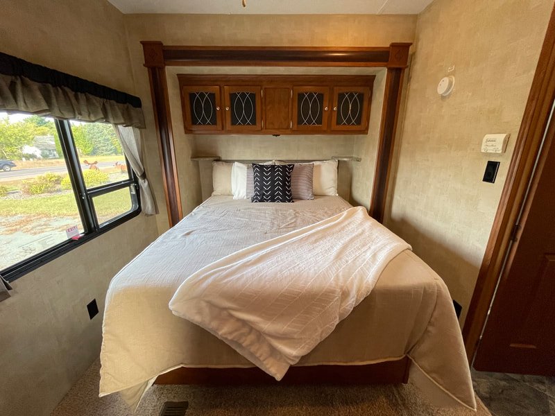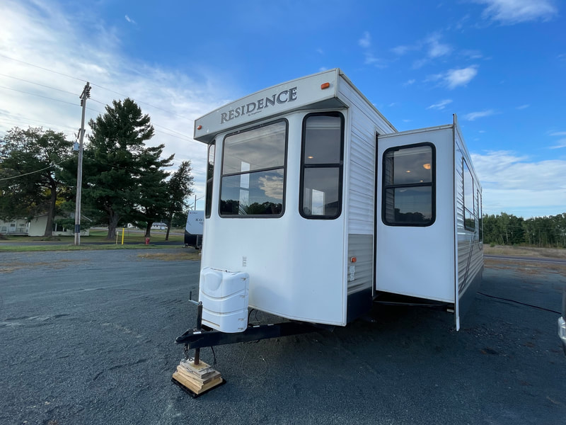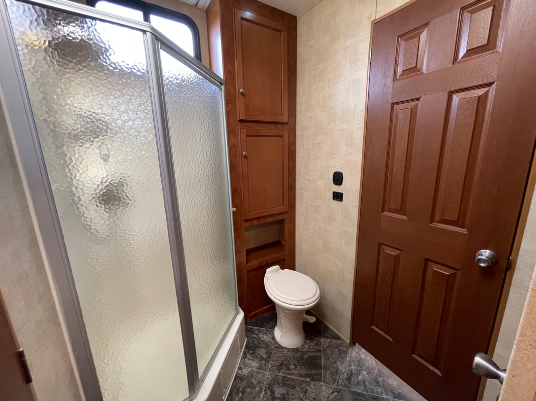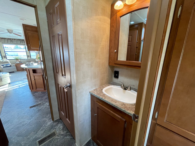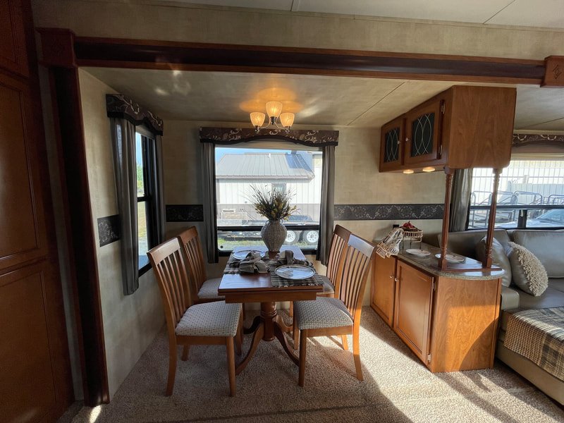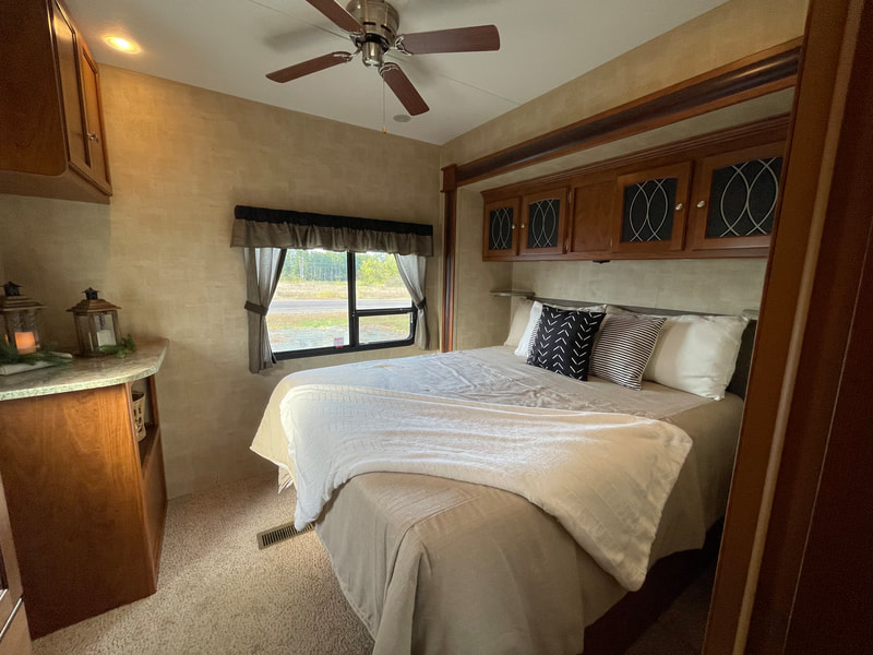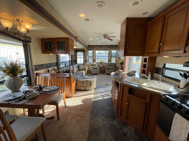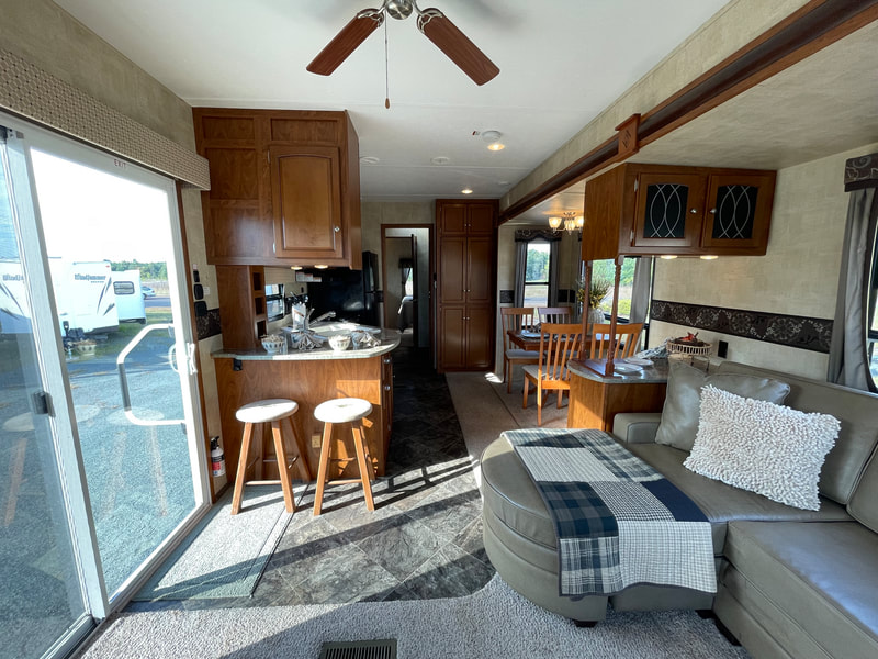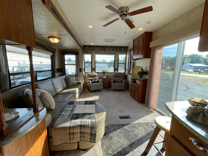 Front living room, 2 slides, air, awning, dinette table with 4 chairs, sectional couch, 2 rockers, 2 barstools, shower with glass door, spacious master bedroom, high ceilings with ceiling fan, and more...