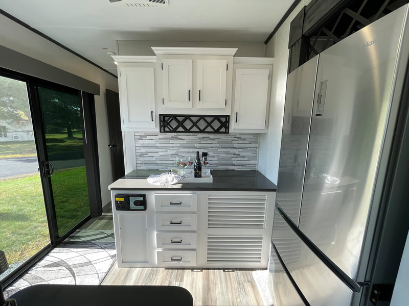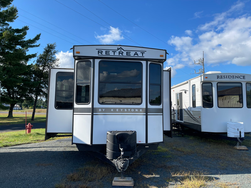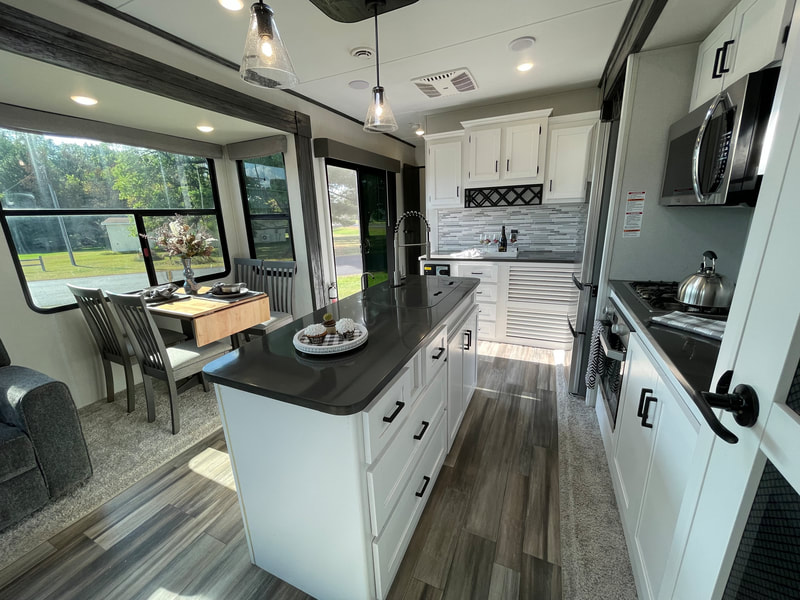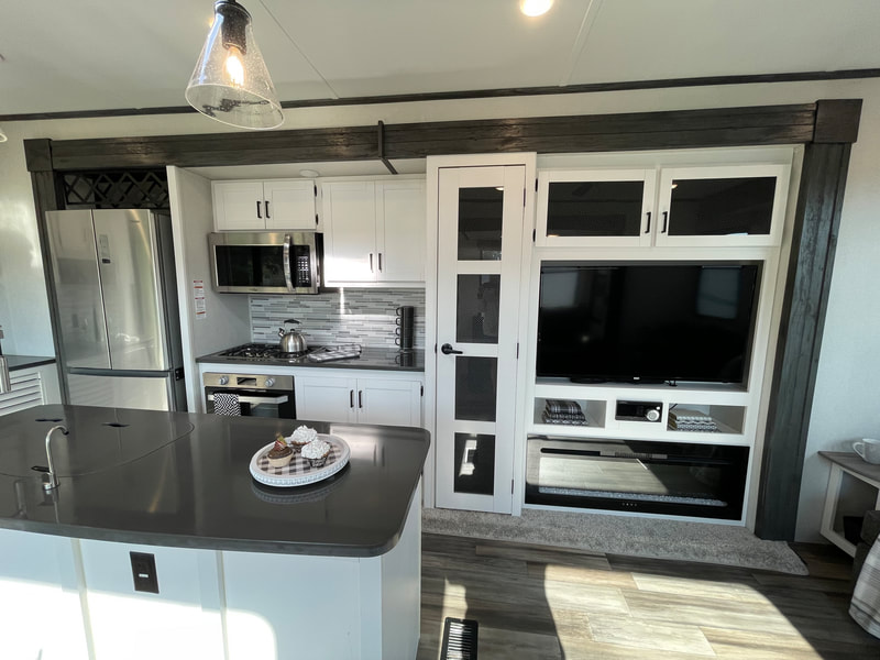 Features: 3 slide-outs, 2 air conditioners, awning, washer/dryer prep, stainless steel french door refrigerator, stainless steel appliances, front living room, 2 couches, dinette table with 4 chairs, TV, fireplace, center island, solid surface countertops, hutch, and more...