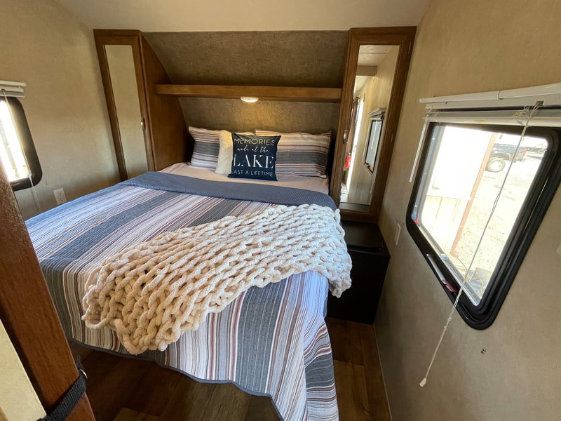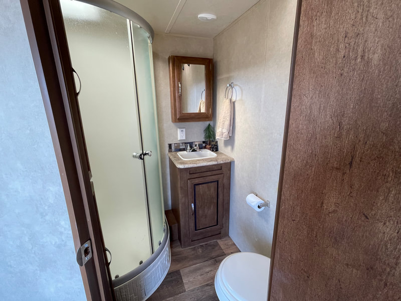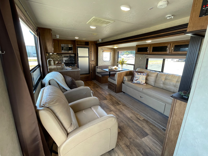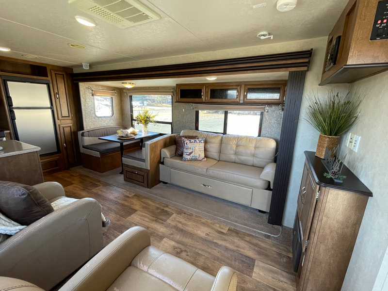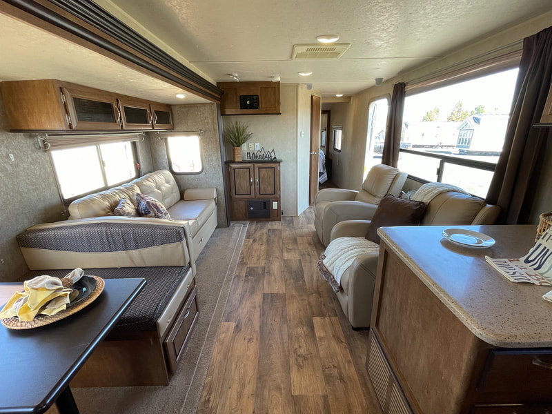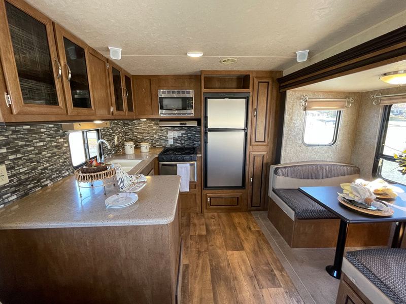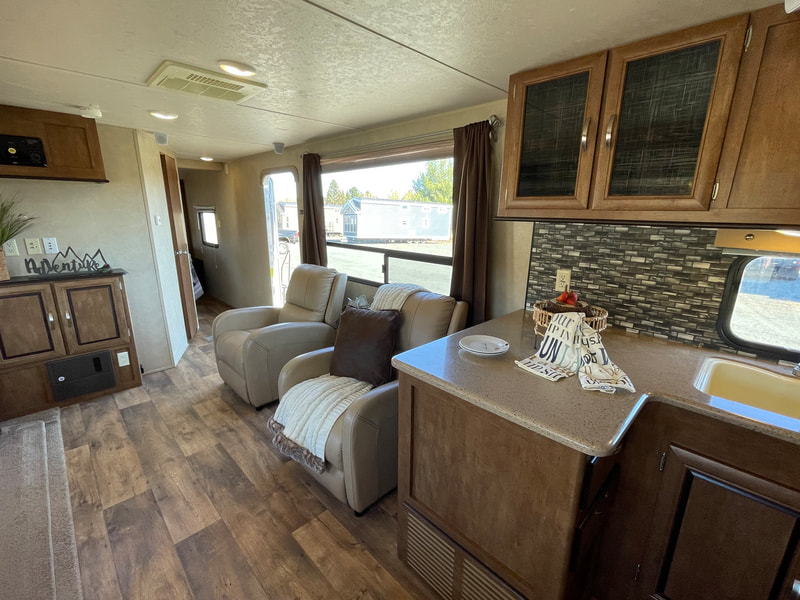 1 slide-out, air, awning, 2 chairs, stainless steel appliances, solid surface countertop in kitchen, Sleeps 6